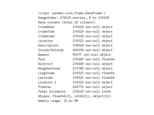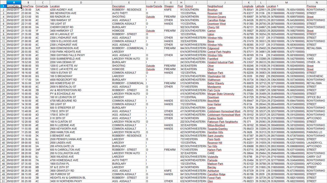 Источником послужит отчёт полицейского департамента Балтимора (BPD). В нём содержатся 276 529 записей обо всех преступлениях, совершённых с 1 января 2012 по 2 сентября 2017 года. Это обычная таблица Excel с указанием времени, мест преступлений, характера преступлений и многой другой информации, которая нам будет полезна; всего 39.2 мегабайт данных.