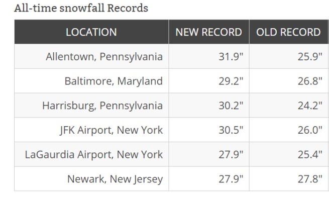 — минимум преступлений произошёл на второй день сильнейшей в истории Балтимора снежной бури, когда толщина снежного покрова на улицах была более 70 сантиметров.